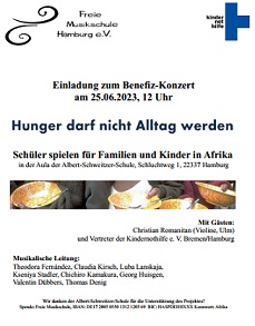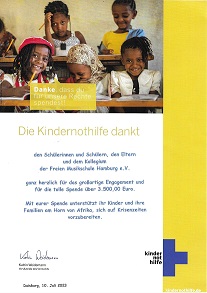 die Kindernothilfe bedankt sich für den großartigen Einsatz und alle Spenden. Bei der Musiktagung vom 23. -25. Juni 2023 - Schüler spielen für Familien und Kinder in Afrika - kam eine Spende von EUR 3.500 zusammen.