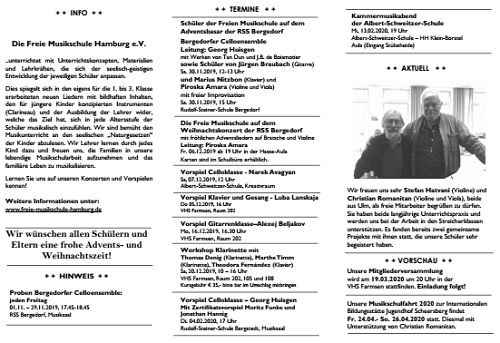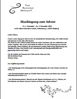 Freitag, 01.12.2023-Sonntag, 03.12.2023 Musiktagung zum Advent in der Albert-Schweitzer-Schule, Schluchtweg 1, 22337 Hamburg.